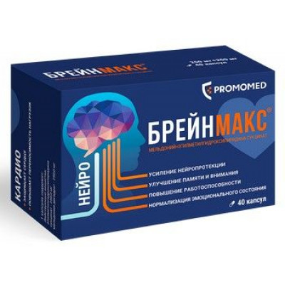 Мельдоний (триметилгидразиния пропионат) это структурный аналог предшественника карнитина-гамма-бутиробетаина, вещества, которое находится в каждой клетке организма человека. Триметилгидразиния пропионат в условиях ишемии восстанавливает равновесие процессов доставки кислорода и его потребления в клетках, предупреждает нарушение транспорта аденозинтрифосфата (АТФ); одновременно с этим активирует гликолиз, который протекает без дополнительного потребления кислорода. Этилметилгидроксипиридина сукцинат, за счет блокирования процесса перекисного окисления липидов, снижает количество свободных радикалов, улучшает структуру и функцию мембраны клеток, транспорт нейромедиаторов и передачу сигналов в синапсах. Применение комплекса триметилгидразиния пропионата и этилметилгидроксипиридина сукцината приводит к синергическому фармакодинамическому взаимодействию двух компонентов по типу конформационно-селективного агонизма к рецепторам, что повышает нейропротекторную активность препарата. В условиях гипоксии препарат БРЕЙНМАКС® приводит к активации выработки энергии в митохондриях, а в условиях снижения кровоснабжения способствует сохранению структуры и жизнедеятельности клеток, в частности нейронов и кардиомиоцитов. При применении препарата БРЕЙНМАКС® оказываемый антиоксидантный, антигипоксический, мембрано- и стресс-протекторный, противосудорожный, анксиолитический, ноотропный и противоишемический эффект двух действующих веществ превосходит фармакологический эффект каждого из компонентов, применяемых в отдельности, что приводит к уменьшению клинических проявлений цереброваскулярной недостаточности, повышению уровня мобильности пациентов, улучшению когнитивных функций, улучшению памяти и внимания, нормализации эмоционального состояния, уменьшению симптомов психического и физического перенапряжения, повышению работоспособности, увеличению толерантности к умственным и физическим нагрузкам, улучшению кровоснабжения органов и тканей, кардиопротекторному действию и улучшению неврологического статуса. Препарат БРЕЙНМАКС® в условиях ишемии замедляет образование некротической зоны и повреждения клеток миокарда, уменьшает агрегацию тромбоцитов, способствует ускорению реабилитации после сердечно-сосудистых событий, поддерживает энергетический метаболизм сердца, что увеличивает переносимость к физическим нагрузкам и способствует снижению частоты приступов стенокардии при сердечной недостаточности. Обладает гиполипидемическим действием, уменьшает содержание общего холестерина и липопротеидов низкой плотности. Способствует дезинтоксикации и улучшает состояние нервной системы при алкоголизме и синдроме абстиненции. В клиническом плацебо-контролируемом исследовании была показана эффективность препарата БРЕЙНМАКС® для лечения пациентов с постковидным астеническим синдромом и симптомами, характерными для состояний после перенесенной вирусной инфекции, такими как астения, нарушения сна, головные боли, головокружение, синдром хронической усталости, нарушения когнитивных функций, ощущение тревоги.