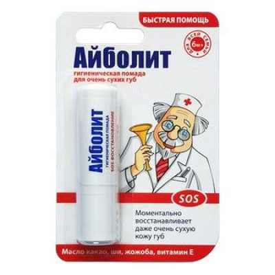 Помада губная гигиеническая Айболит® "SOS-ВОССТАНОВЛЕНИЕ" - моментально восстанавливает сухую кожу губ; успокаивает, питает и смягчает; надежно защищает от неблагоприятного воздействия окружающей среды. Содержит масло ши, какао и жожоба, экстракт ромашки и витамин Е. Не содержит минеральных масел, парафина, консервантов, красителей и отдушек