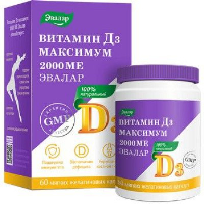 Витамин D3 максимум 2000 МЕ Эвалар – это удобные мягкие желатиновые капсулы высокоусвояемого витамина D3 с высокой дозировкой 2000 МЕ. Быстро восполняет дефицит витамина D3 в организме.